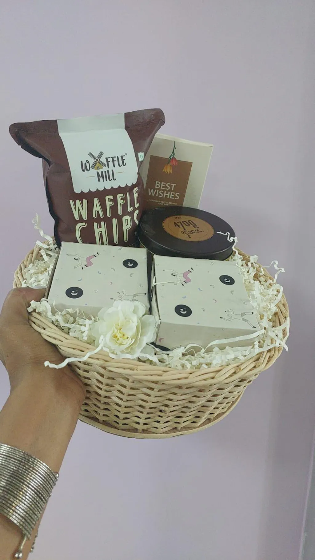 This hamper also comes with a personalized greeting card, allowing you to express your heartfelt message. All items are elegantly arranged in a reusable cane basket, combining practicality with style. The thoughtful selection of snacks and treats makes it a versatile gift for a wide range of occasions, reflecting care, appreciation, and celebration.