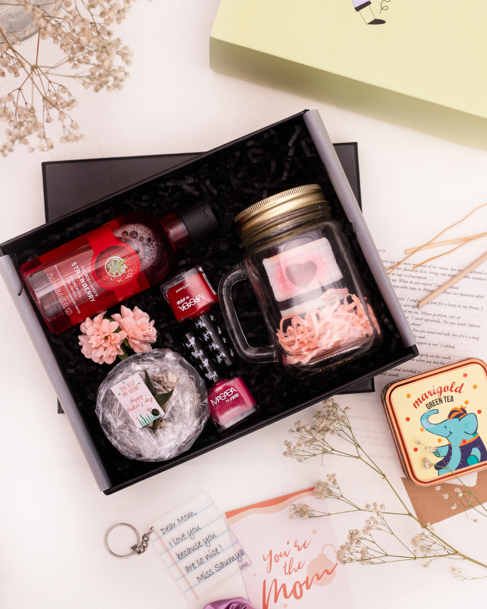 • Mason Jar with Nykaa Masaba Nail Paints x 2, Scrunchie and Rose Shape Soap 100 g