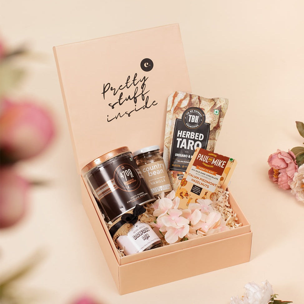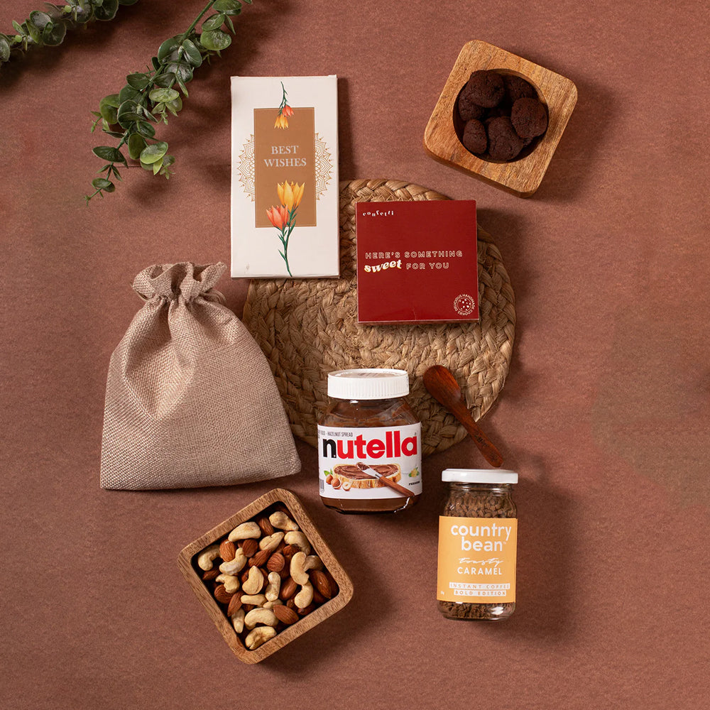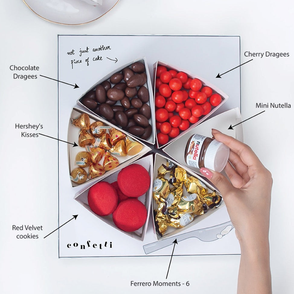 Gift our Red Velvet Cake Box, a divine selection of rich goodies for any dessert enthusiast. Therein, find a mini Nutella jar and a mix of chocolate and red dragees for a rush of sweetness. It’s a better way to treat yourself to the decadent Ferrero Rocher assortment and golden Hershey's Kisses, paired with delicious Red Velvet cookies. Delight in the showstopper: Red Velvet pastry slices that dissolve in your mouth. All the items in the Red Velvet Cake Slice Hamper come in an OHP box along with a greeting card of your choice; the hamper itself is a heaven in a slice for any time.