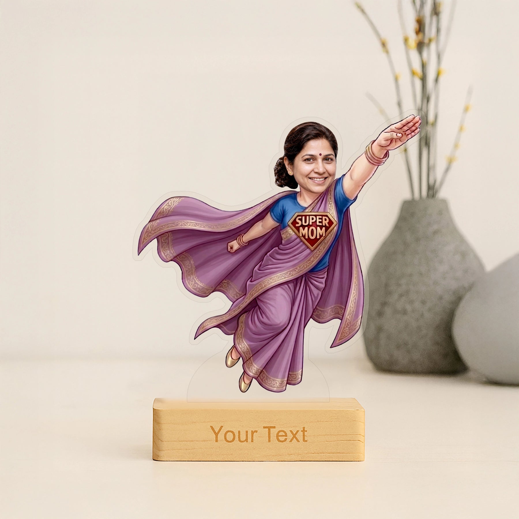 Mother's Day Gift The one she was not expecting and will not stop showing people. A caricature made from her photo, with a cape, on a stand she can put anywhere. It earns its moment and then some.
